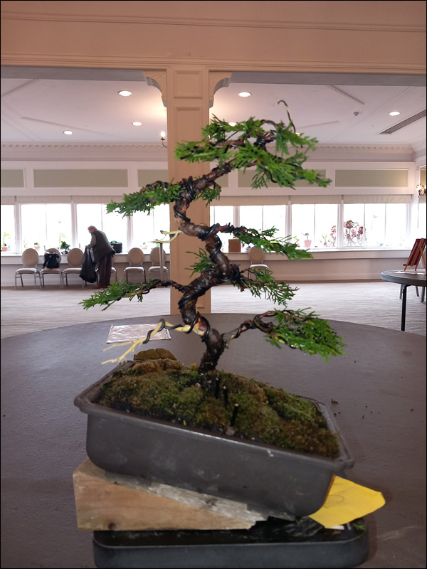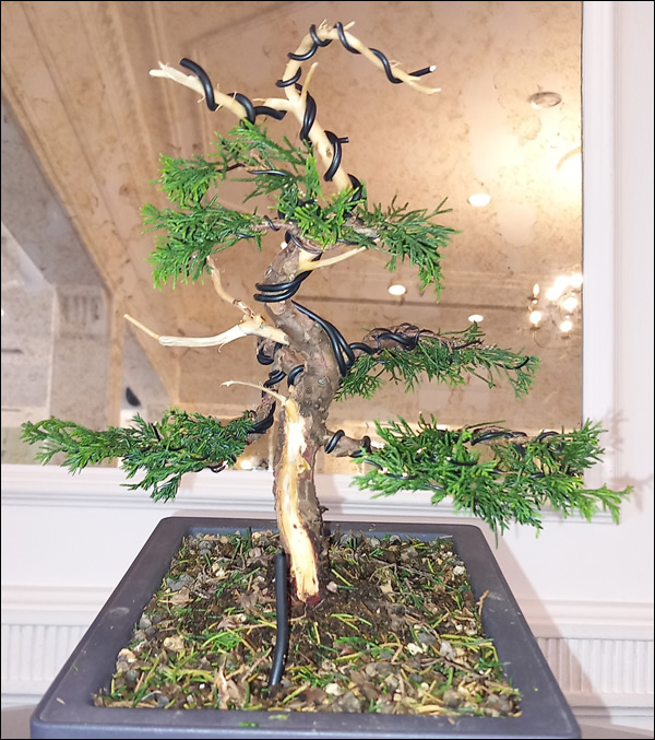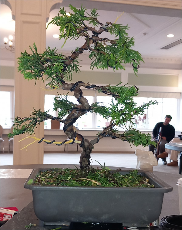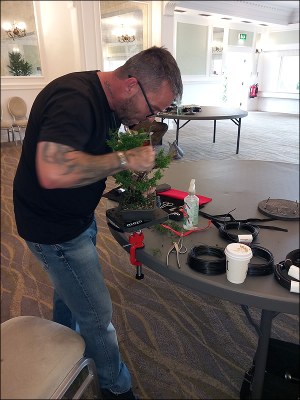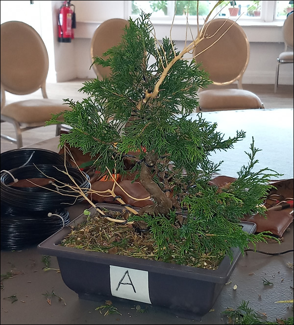 They duly drew lots to select three out of four small Junipers. They then had from 11.00am until 2pm to work their magic. Forthcoming were three individual but well-presented young Bonsai.